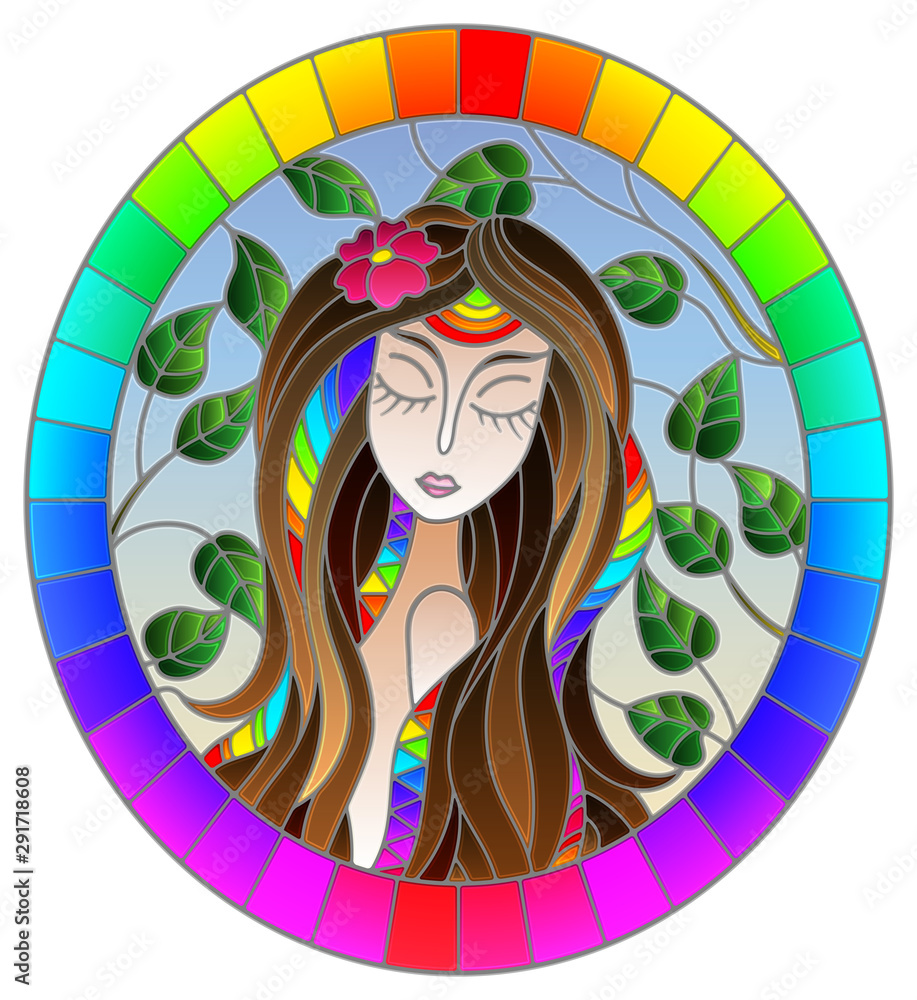 The Illustration In Stained Glass Style Painting With A Girl With Brown Hair And Tree Branches On Background Of Blue Sky Oval Image In Rainbow Frame Stock Vector Adobe Stock